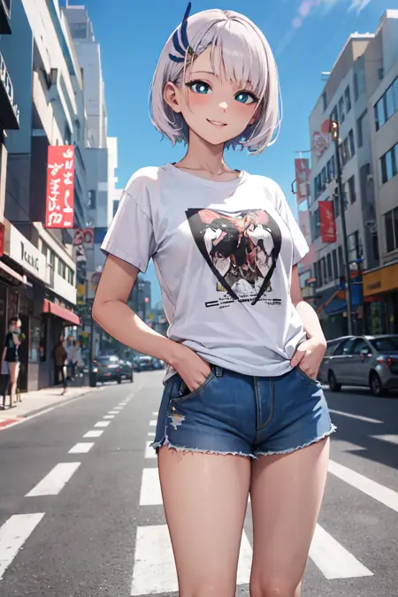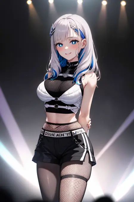 "ReinePop、明るい瞳、ヘアクリップ、マルチカラーのヘア、クロップドブラックチューブトップ、ブラックグローブ、ブラックショートパンツ、タイツ、フィッシュネット、スリムストラップ"
