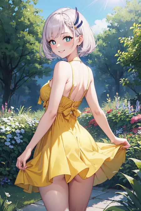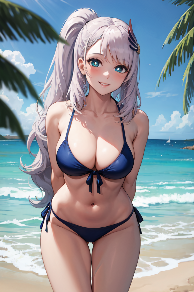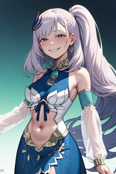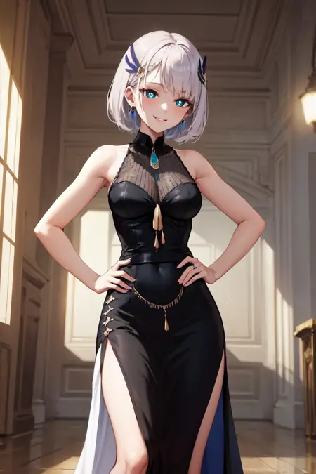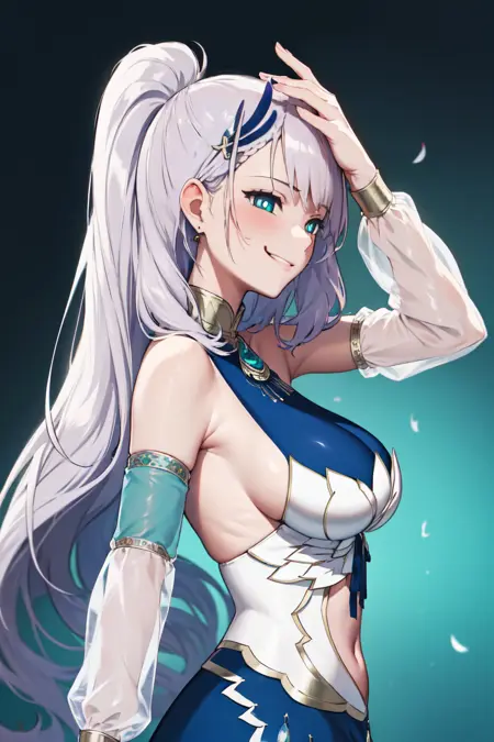 "ReineBase、明るい瞳、ロングヘア、サイドポニーテール、フェザーのヘアアレンジ、ブルードレス、ナセルカットアウト、脱着式スリーブ、イヤリング、白のレッグウェア"
