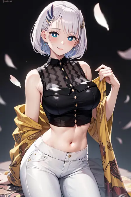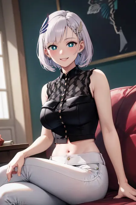 "ReineCasual、明るい瞳、ショートヘア、フェザーのヘアアレンジ、黒のシャツ、ノースリーブ、ミッドリフト、白のパンツ、ショール、イヤリング"