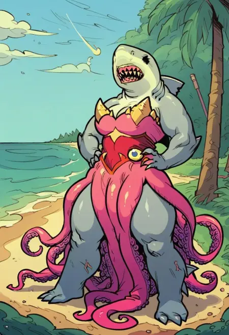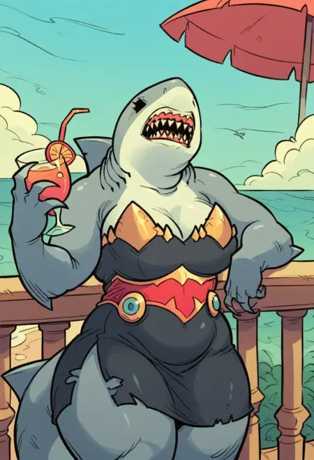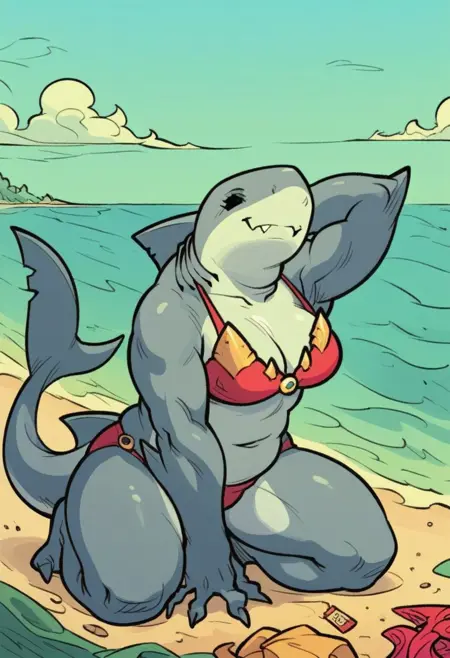 タグ: "Prin_5hark, shark, anthro, monster girl, grey skin, black eyes, sharp teeth, claws, large breasts"