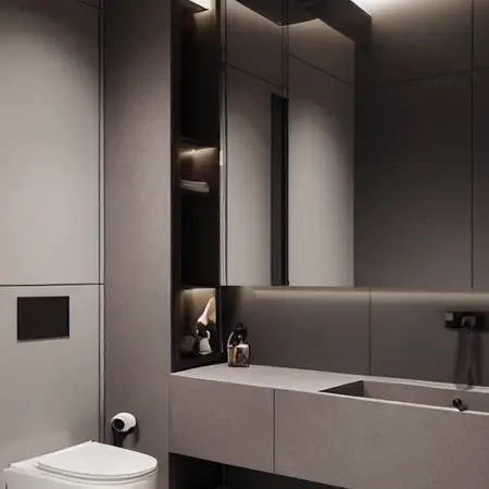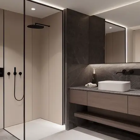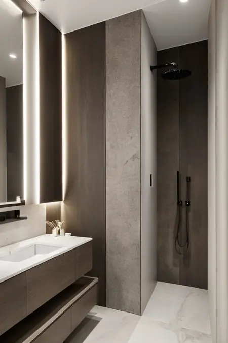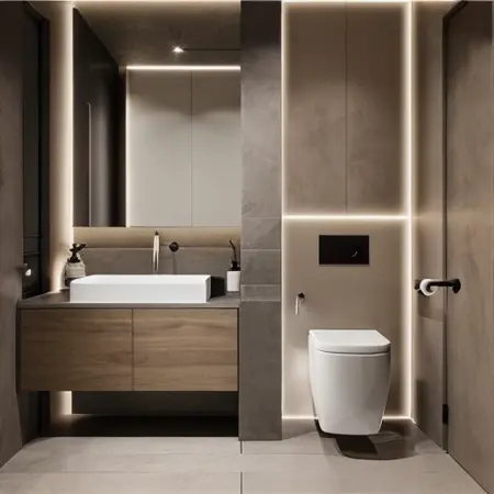 モデル紹介: 木目タイル、単色タイル、さまざまな形状の洗面キャビネットを含む、多彩な色合いのバスルームトレーニングセット。