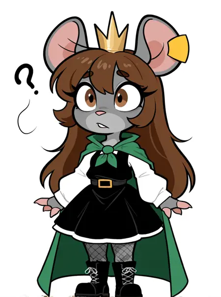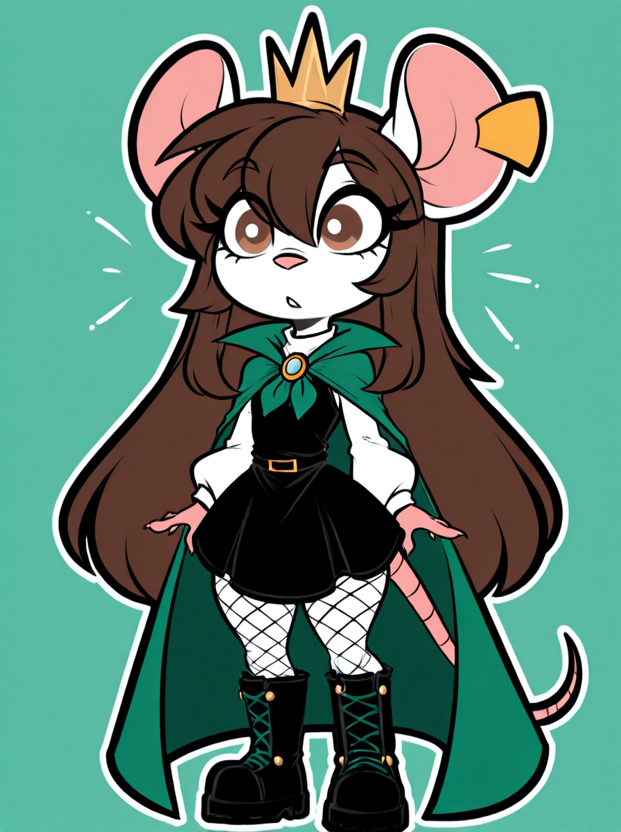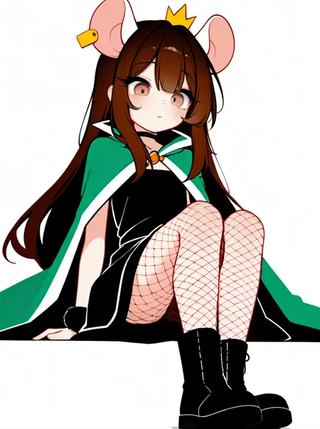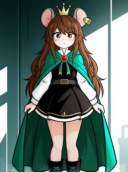 트리거: 1girl, rodent, light grey body, mini crown, brown hair, long hair, light brown eyes, rat ears, ear tag, long eyelashes, petite, black dress, green cape, fishnet pantyhose, boots, white sleeves