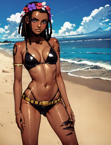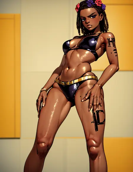 服装:比基尼,珠宝,辫子,项链,红花,紫花,口红,紫色口红
