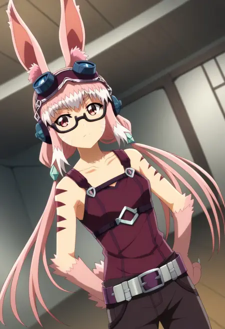 1girl,netherland mithlim,rabbit girl,claws,animal hands,animal feet,monster girl,animal ears,rabbit ears,long hair,multicolored hair,pink hair,white hair,low twintails,bangs,red eyes,rabbit tail,goggles on head,glasses,headphones,Netherland Mithlim outfit,pants,bare shoulders,collarbone,sleeveless,belt,barefoot