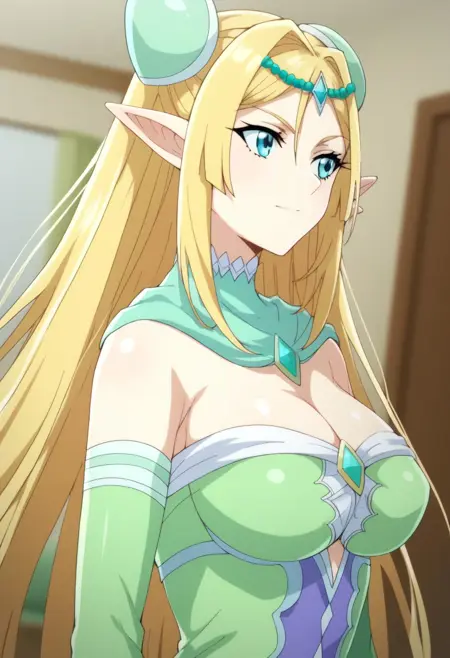 1girl,eldriel fruitalia,elf,pointy ears,very long hair,blonde hair,blue eyes,hair ornament,large breasts,Eldriel Fruitalia outfit