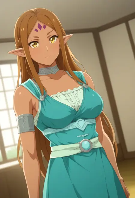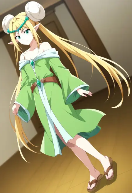 1girl,eldriel vegan,elf,green eyes,pointy ears,blonde hair,very long hair,hair ornament,bare shoulders,hair bun,twintails,eldriel vegan outfit,green dress,wide sleeves,brown belt,robe,circlet,sandals