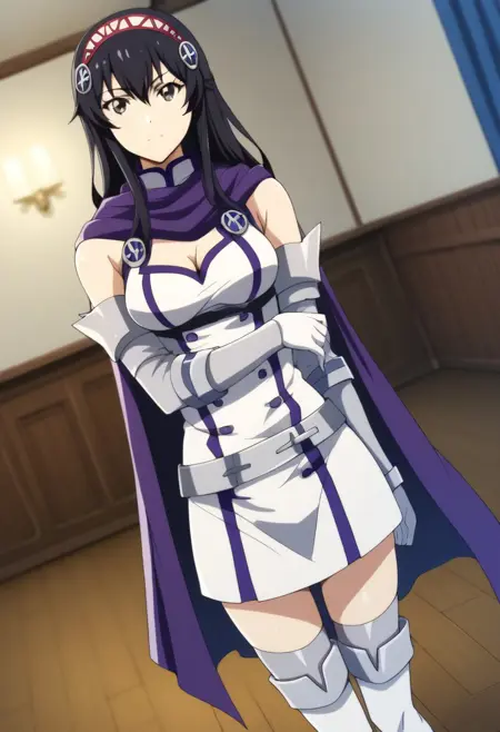 1girl,sanctos luvelia,long hair,black hair,black eyes,medium breasts,hairband,Sanctos Luvelia outfit,dress,cleavage,purple scarf,cape,elbow gloves,zettai ryouiki,thighhighs,white footwear,boots