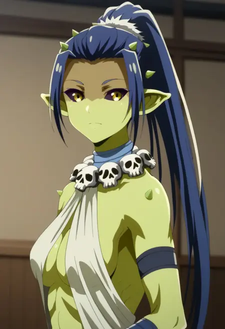 1girl,nggiell gobuko,monster girl,black sclera,yellow eyes,colored skin,green skin,pointy ears,long hair,blue hair,ponytail,jewelry,skull necklace,Nggiell Gobuko outfit,barefoot
