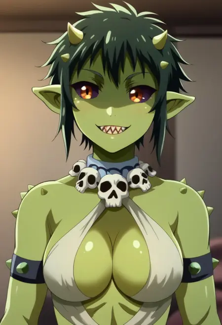 upopotamas ngapopo, upopotamas ngapopo outfit, green skin, breasts, colored skin, pointy ears, 1girl, colored sclera, short hair, teeth, skull, jewelry, necklace, black hair, smile, cleavage, monster girl, solo, sharp teeth, black sclera, horns, medium breasts, large breasts, green hair,