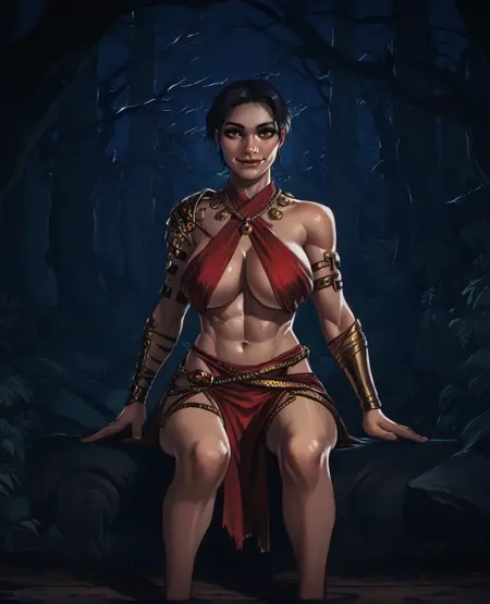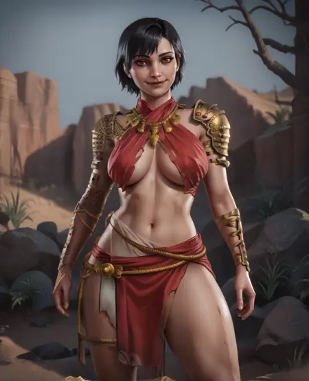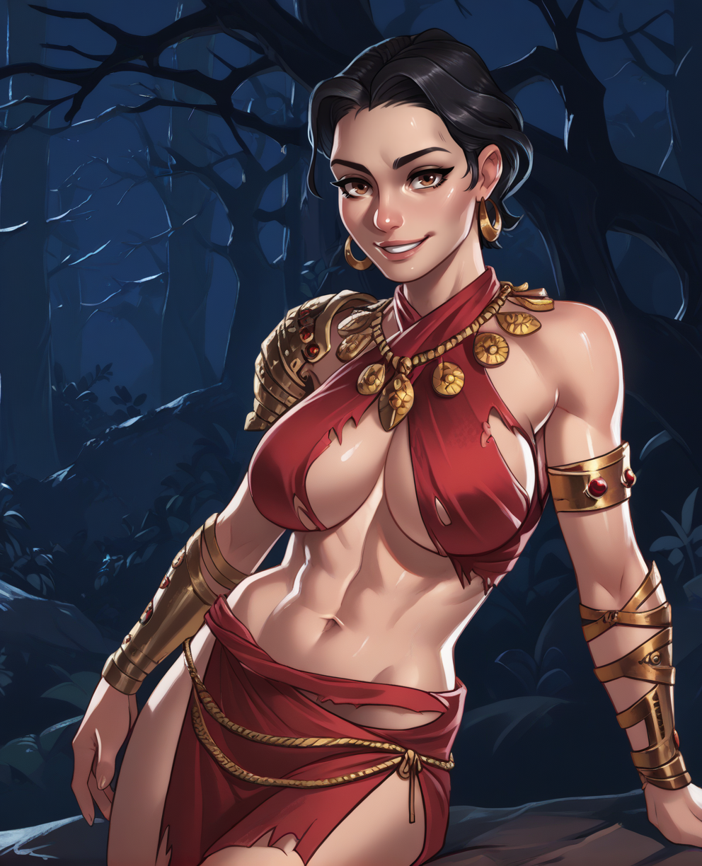 胸巻き、へそ、腕巻き、骨盤カーテン、破れた服、スカート、ゴールドのジュエリー、ネックレス、ゴールドのベルト、