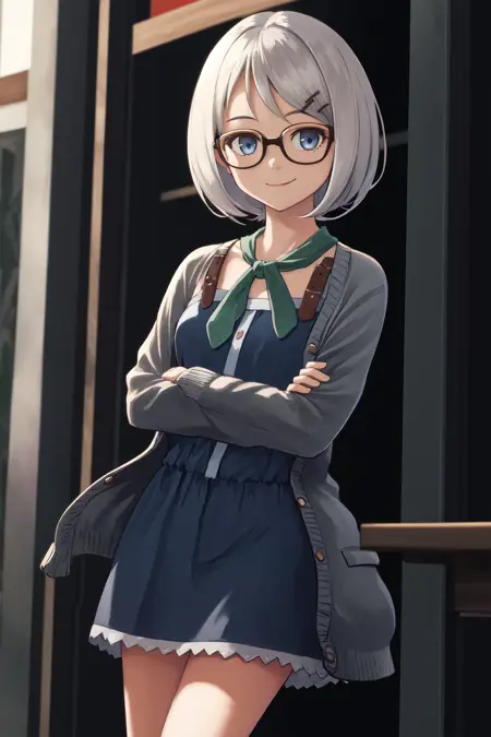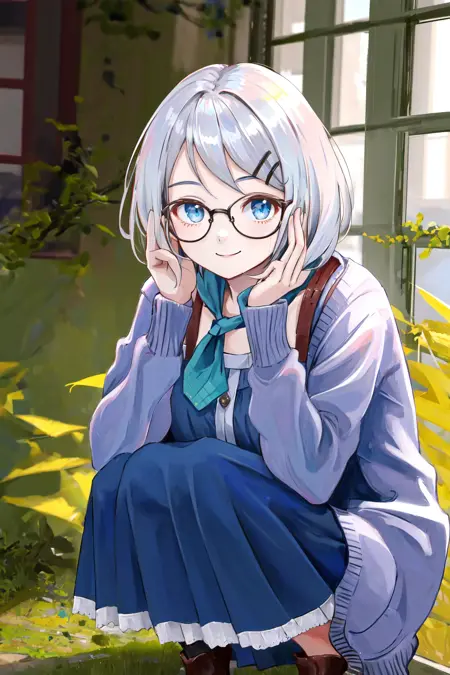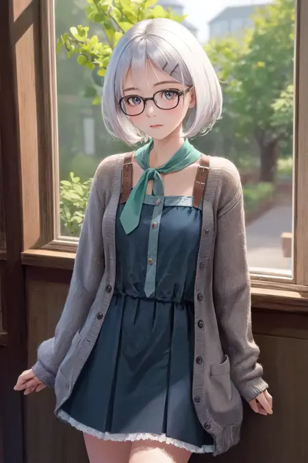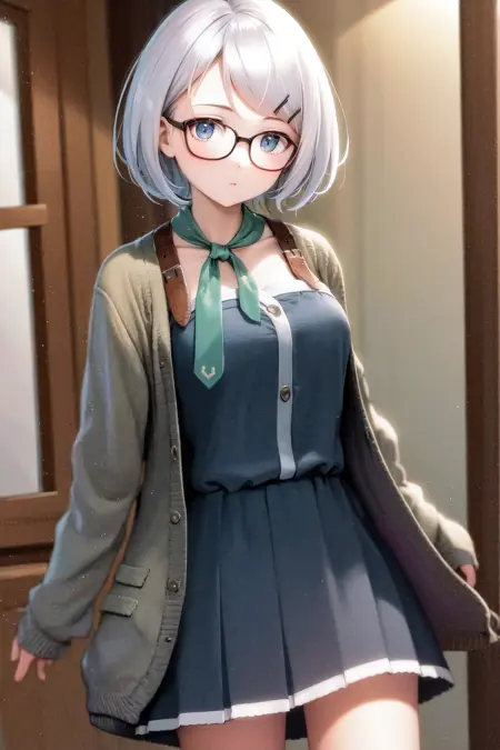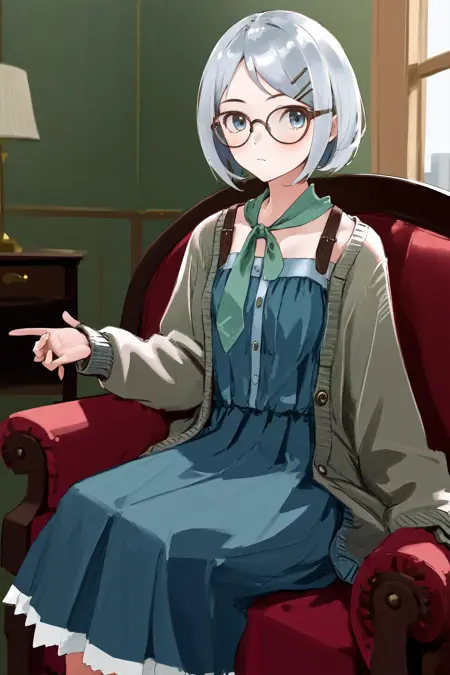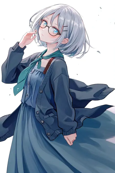 默认服装:蓝色连衣裙 领巾 长袖 开襟毛衣