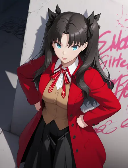 Tag & Original: Rin_Tohsaka_NYX, blue eyes, black hair, two side up, parted bangs, hair ribbon, black ribbon