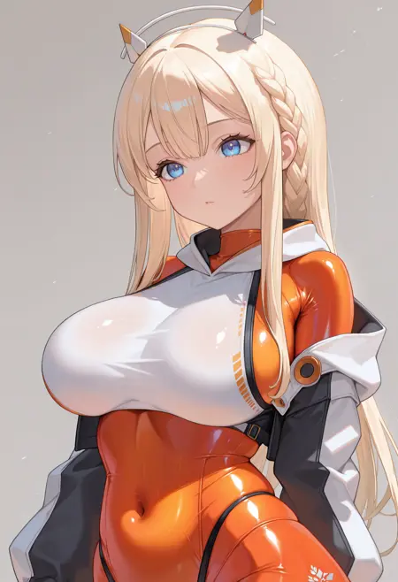 tovdf,蓝眼睛,金发,长发,发辫,头饰,大胸部,白衬衫,无袖,露脐装,橙色紧身衣,肚脐覆盖,丁字裤,短款夹克,兜帽下垂