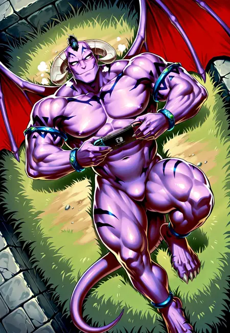 demon tail, horns, demon horns, demon wings, black hair, mohawk hair, purple skin, no pupils, nude, blue bracelet, blue anklet, green jewelry, tattoo,