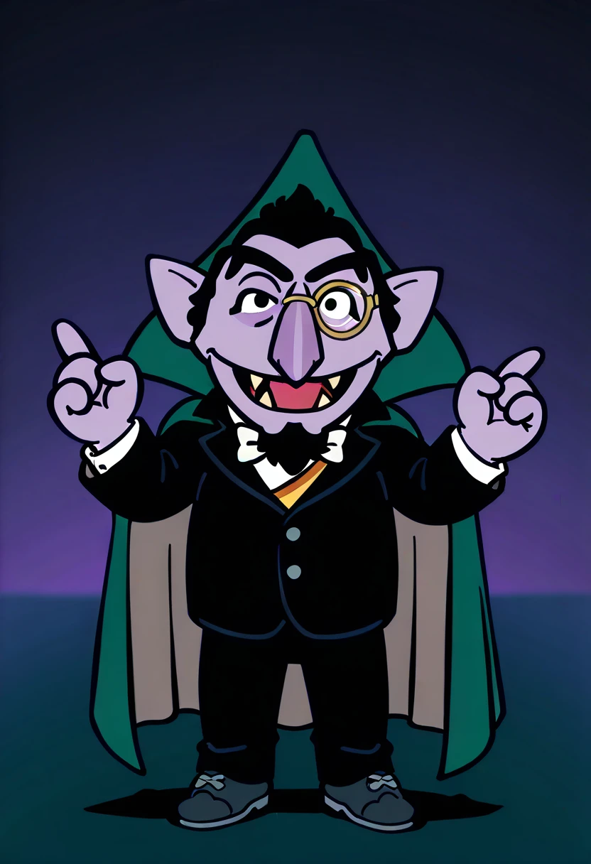 CountVonCountSS, 1boy, purple skin, pointed ears, visible fangs, black suit, green cape, black hair, black eyes, monocle on right eye, black goatee, vampire, white bowtie, white shirt