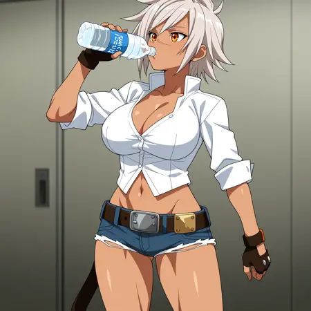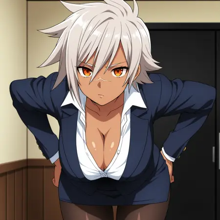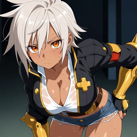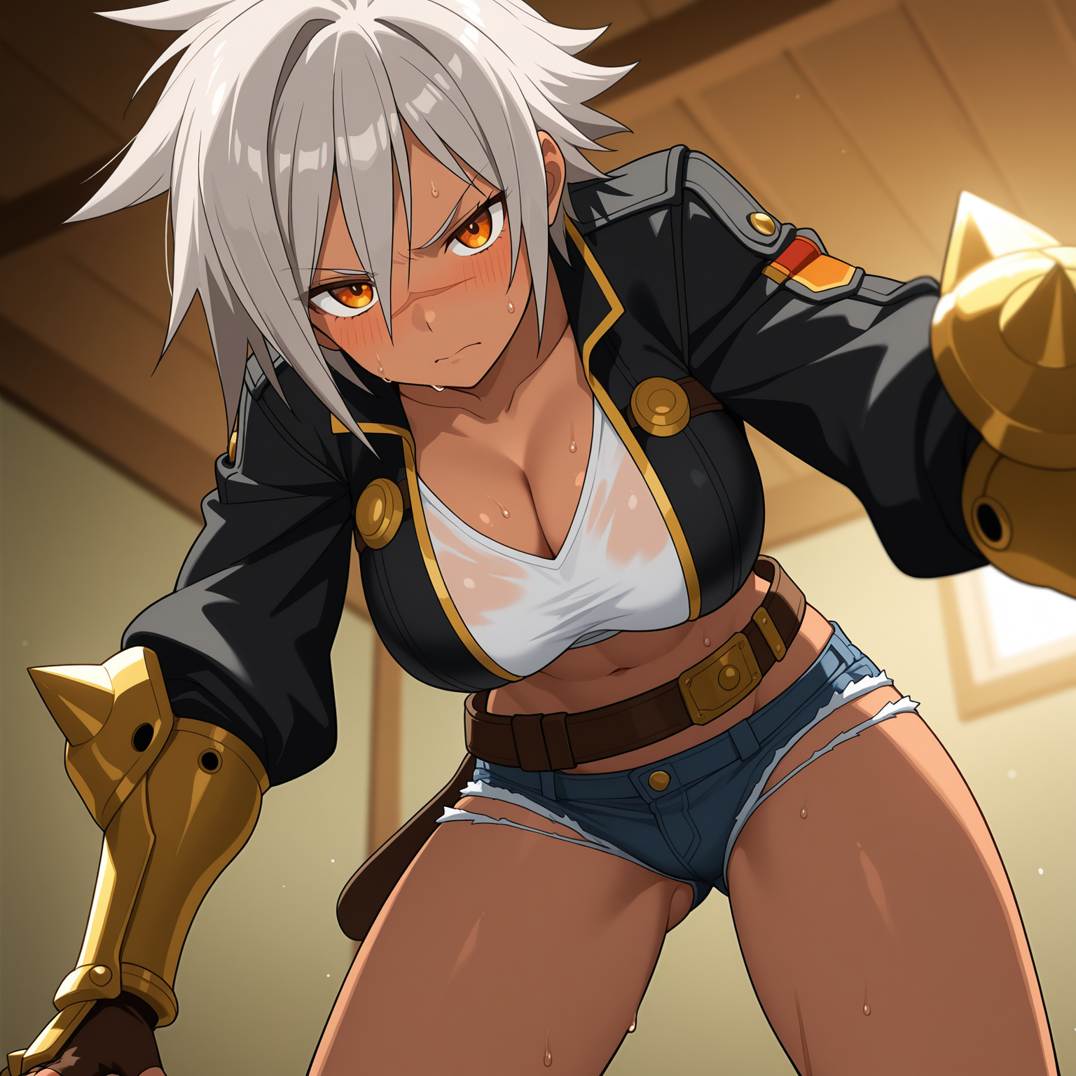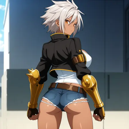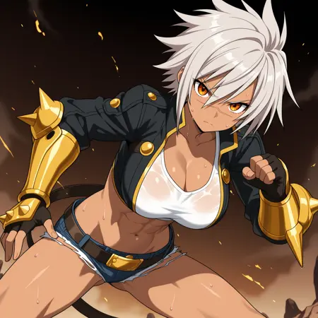 BulletBB, dark skin, grey hair, spiked hair, orange eyes, scar on face, large breasts, toned, wide hips, black jacket, white shirt, cleavage, micro shorts, lowleg, groin, belt, loose belt, gauntlets, fingerless gloves, boots,