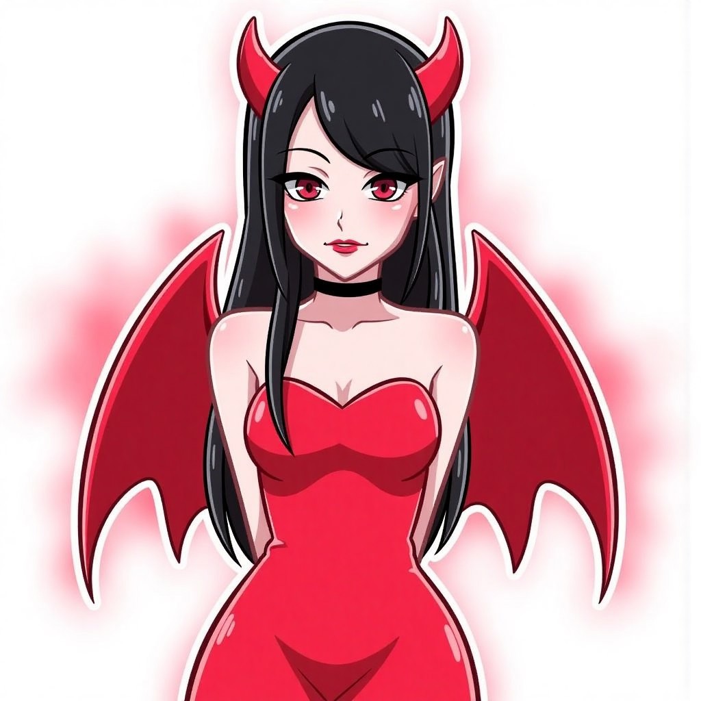 1girl, black hair, long hair, red eyes, slit pupils, red horns, bat wings, red wings, strapless dress, red dress, black choker, red lips