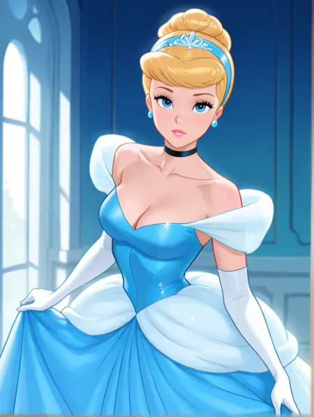 肘部手套、金发、项圈、发髻、蓝色连衣裙、蓝眼睛、白色手套、单个发髻、露肩连衣裙、蓝色发带、耳环、珠宝、胸部曲线、锁骨,