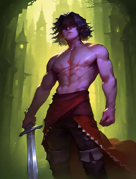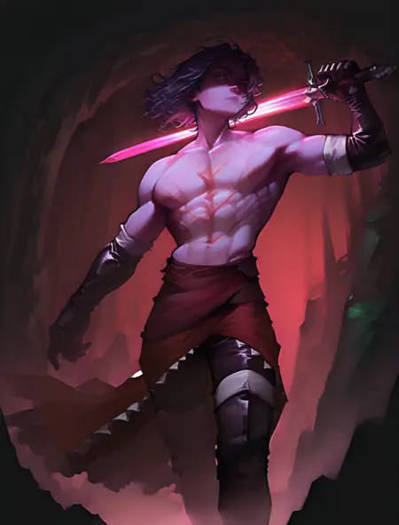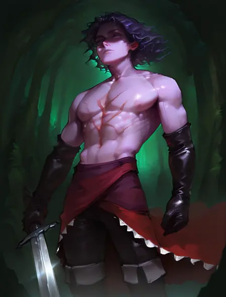 scar on chest, black gloves, waist sash, red skirt, black pants, black boots