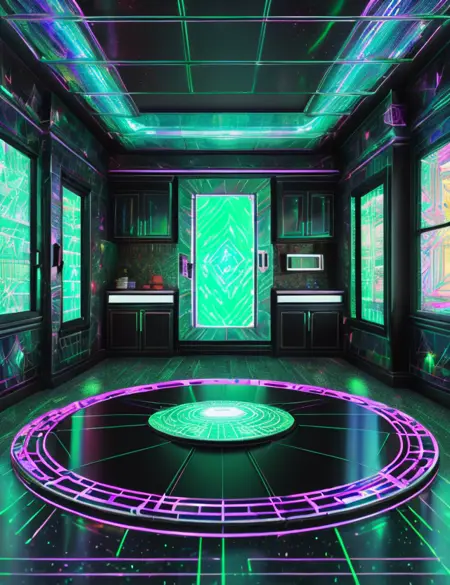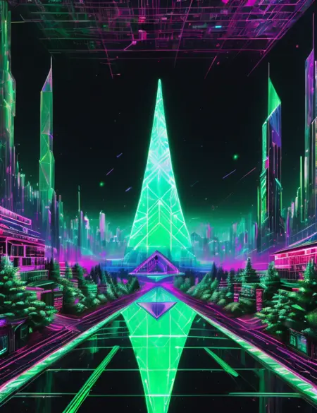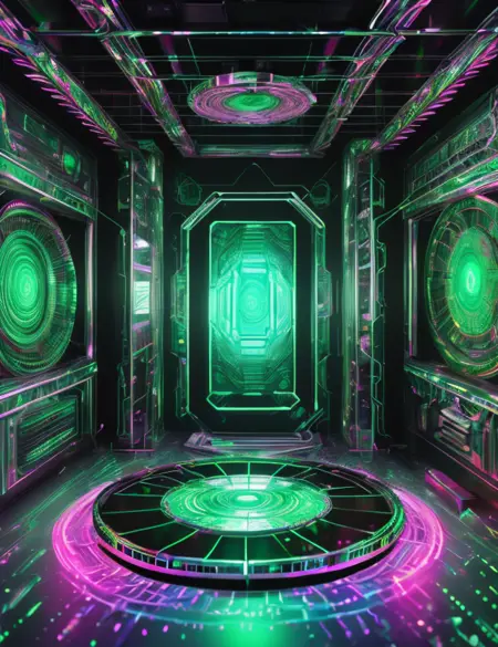 经典赛博空间,沉浸在绿色与品红交织的霓虹交响曲中,流淌着数字时代的精髓,信息如电流般贯穿虚拟世界的脉络。