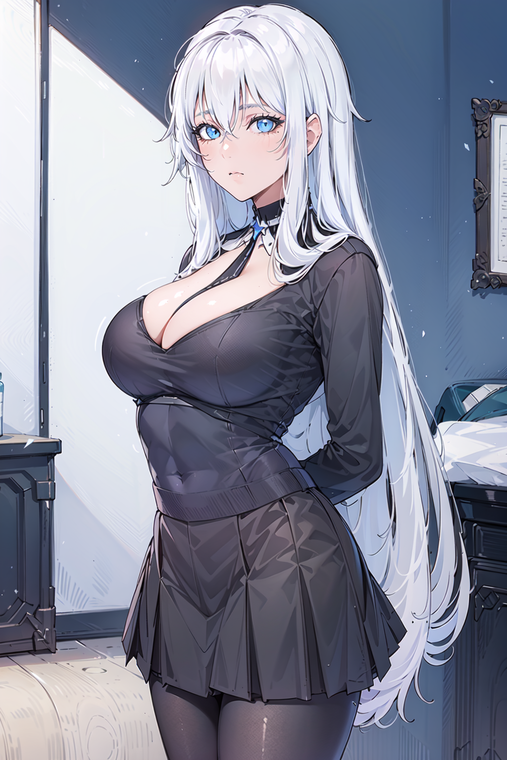 snsoyuz, sovetsky soyuz (azur lane), 1girl, solo, long hair, breasts, looking at viewer, large breasts, gloves, hat, dress, cleavage, hair between eyes, very long hair, white hair, black gloves, white dress, coat, fur trim, white headwear, ice, military hat, white coat, fur-trimmed coat