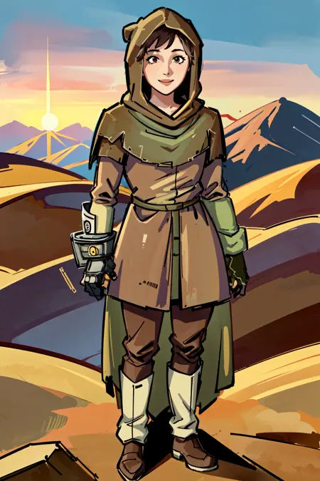 《辐射:新维加斯》中的维罗妮卡·桑坦杰洛。触发词为“VeronicaFNV”,建议使用较高权重。推荐使用“带帽斗篷、棕色服装、护腕、单只手套”来还原她的默认游戏服装(尽管一如既往,让SD模型可靠地呈现动力拳套颇具挑战)。