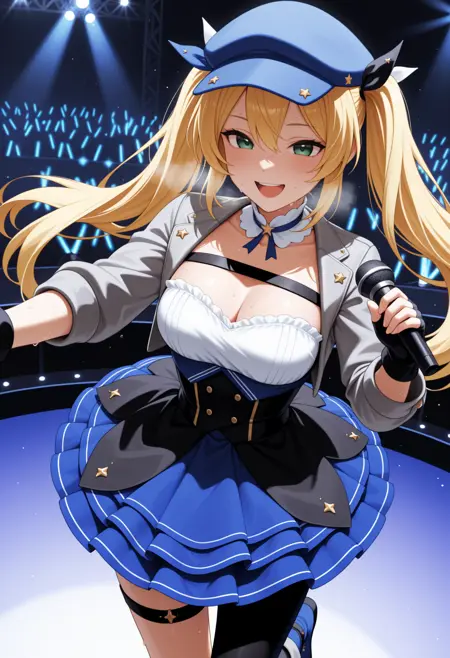 D0kiOrgnl, 緑の目, 金髪, 長髪, ツインテール, 青い帽子, 髪リボン, 外れ襟, 胸バンド, 短めのジャケット, グレーのジャケット, 青いドレス, 黒いコルセット, 黒い手袋, 指なし手袋, 片足タイツ, 太ももストラップ, 青いブーツ