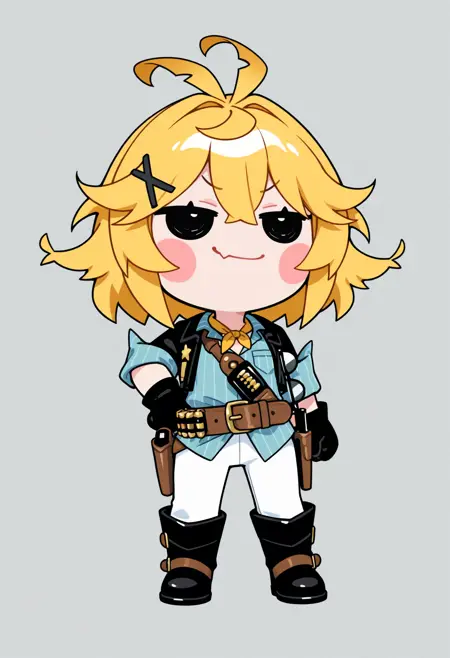 D0kiDef, 緑の目, 金髪, 短髪, 立ち髪, x 髪の飾り, 皮の牙, 黄色いネッカチーフ, 青いシャツ, 縦縞シャツ, ポロシャツ, 袖をまくった, バンドリエール, 茶色のベルト, ホルスター, 黒いジャケット, 黒い手袋, 白いズボン, 黒いブーツ