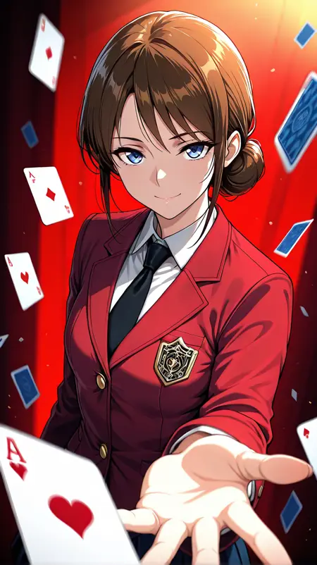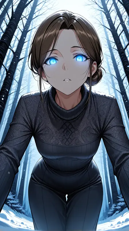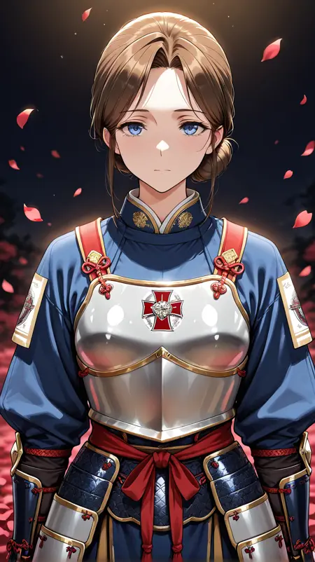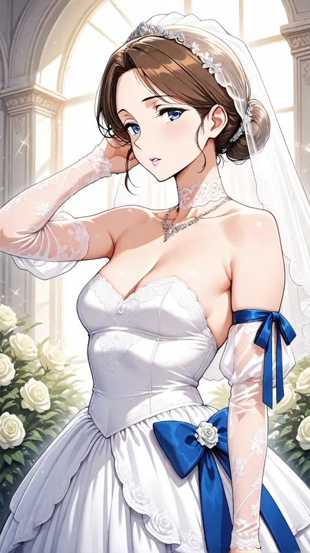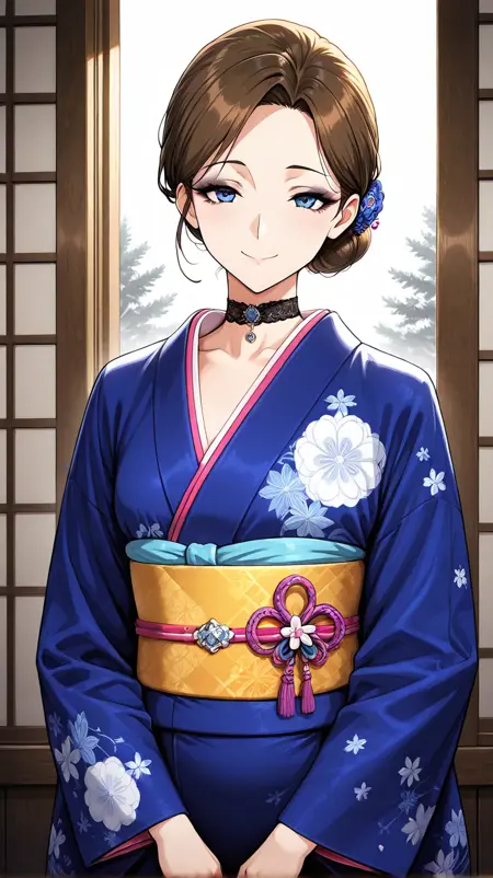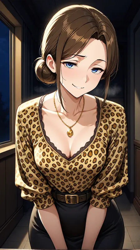 1girl, solo, il_mother, blue eyes, brown hair, single hair bun, small breasts, mature female,
