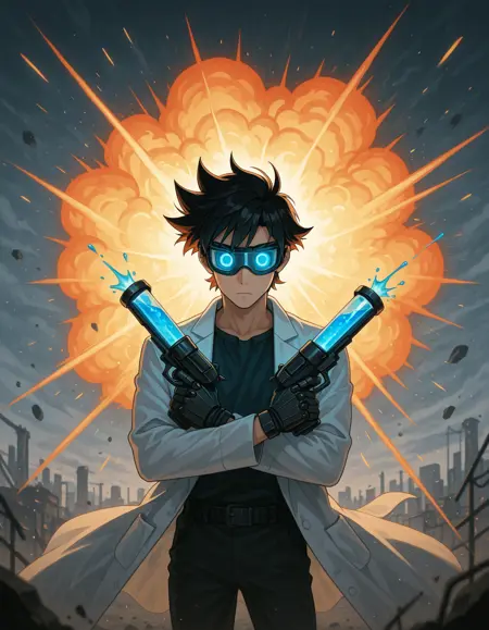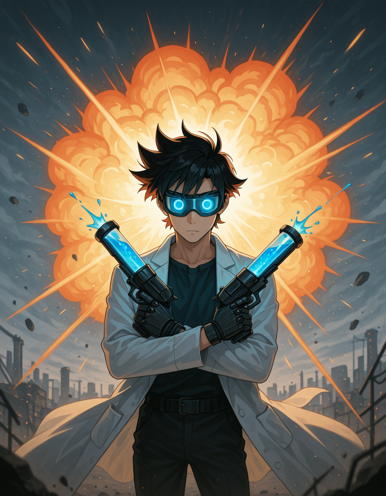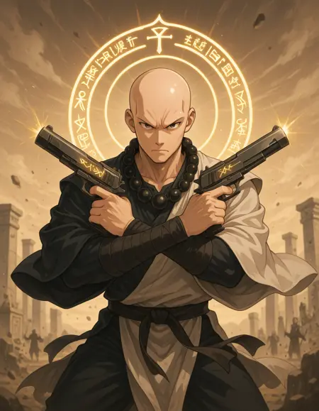 "Flatline, Flat vector illustration,,masterpiece, best quality, good quality, very aesthetic, absurdres, newest, 8K, depth of field, focused subject, dynamic angle, A stoic, peaceful anime monk — bald head, prayer beads — suddenly in a battle stance, crossing sacred relic pistols in an X pose. Glowing runes swirl as the air distorts with suppressed power. Background: ancient temple shattered by spiritual force. x pistol pose "