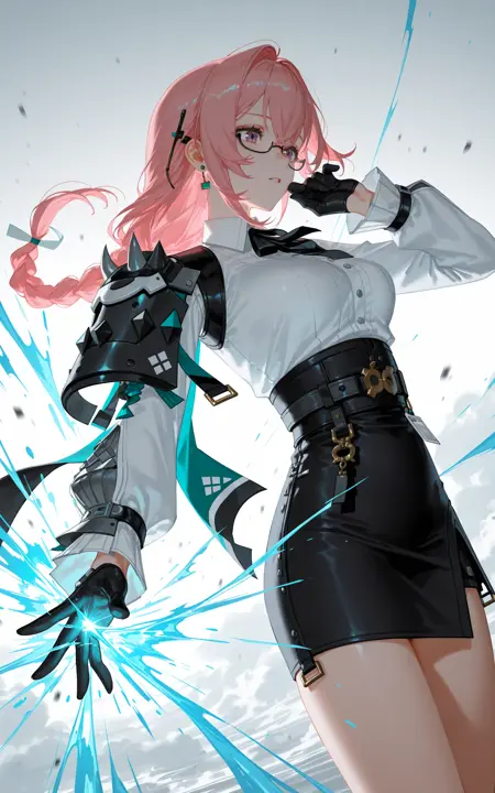 全身:tsukishiro yanagi\(zenless zone zero\),1girl,solo,long hair,pink hair,pink eyes,glasses,