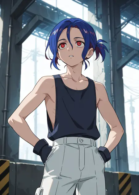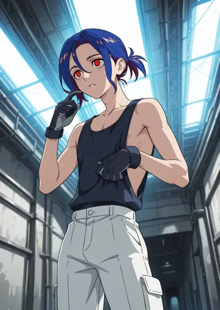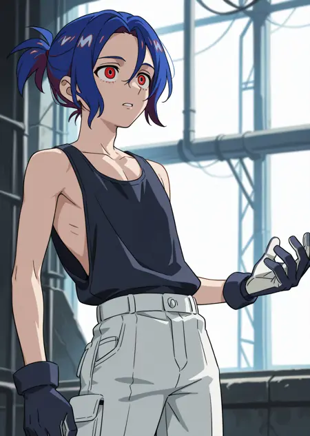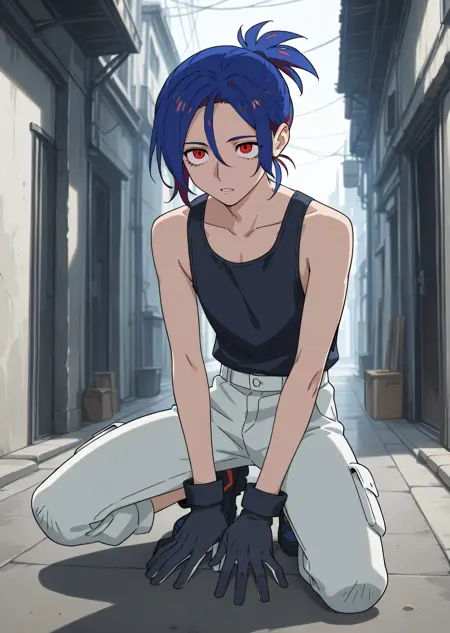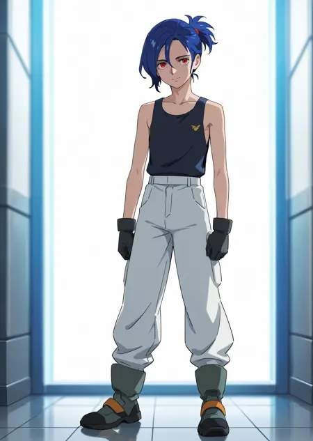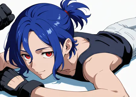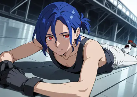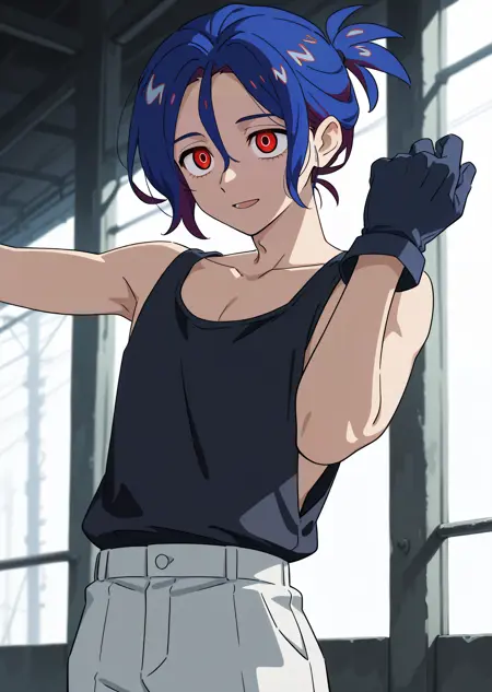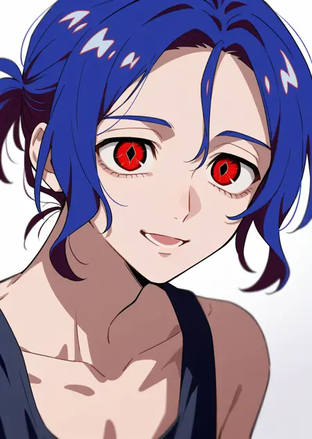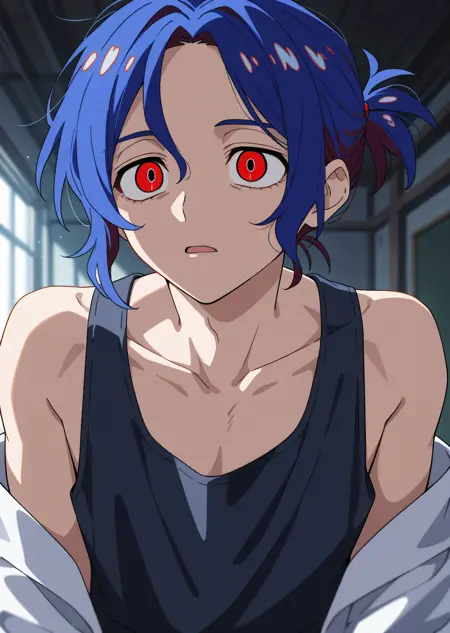 1boy, shujiito, red eyes, blue hair, short ponytail, hair between eyes,