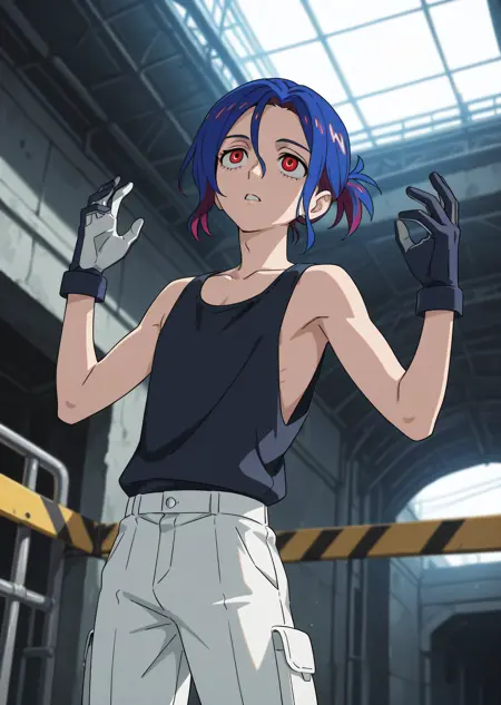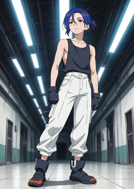 black tank top, white shirt, gloves, pants, white pants,