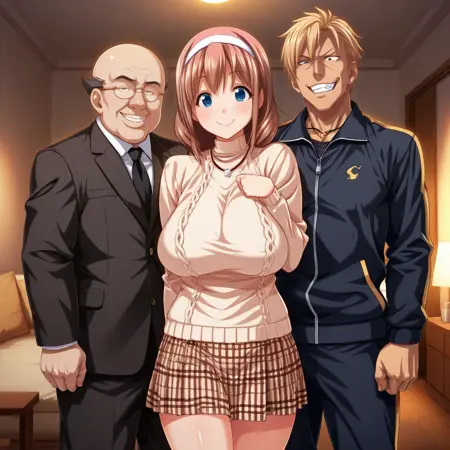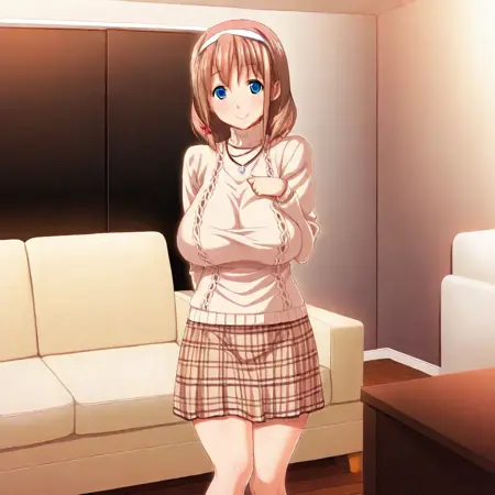 코하루 히노모토: 1girl, koharu, brown hair, blue eyes, white headband, beige sweater, necklace, light brown checkered skirt,