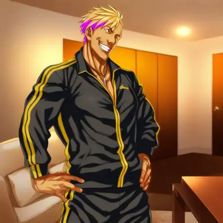 마사루 아사오카: 1boy, masaru, blonde hair, black eyes, black track suit, black track pants, muscular, necklace,