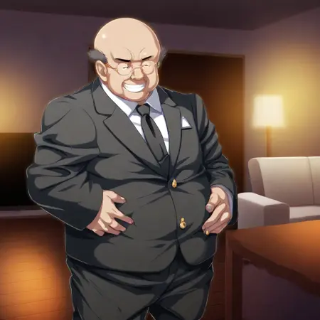 겐조 아사오카: 1boy, genzou, glasses, bald, black eyes, black suit jacket, black pants, white shirt, black tie,