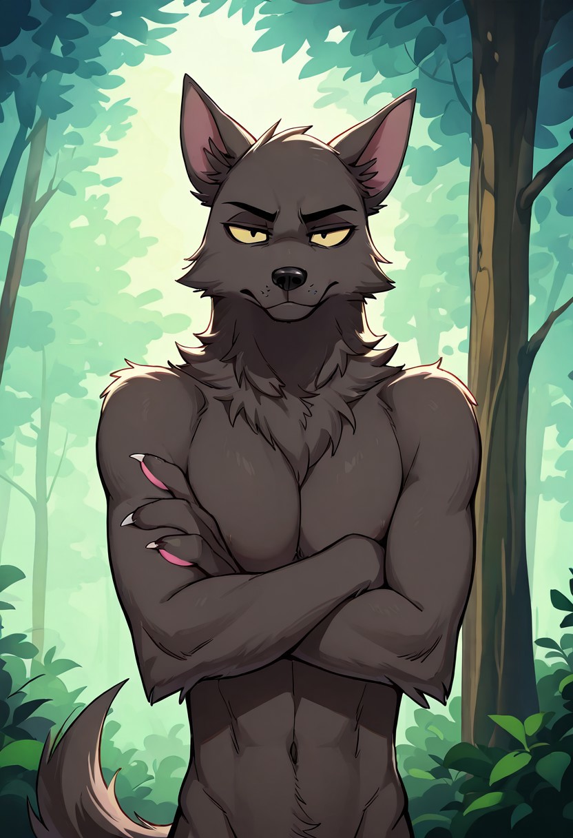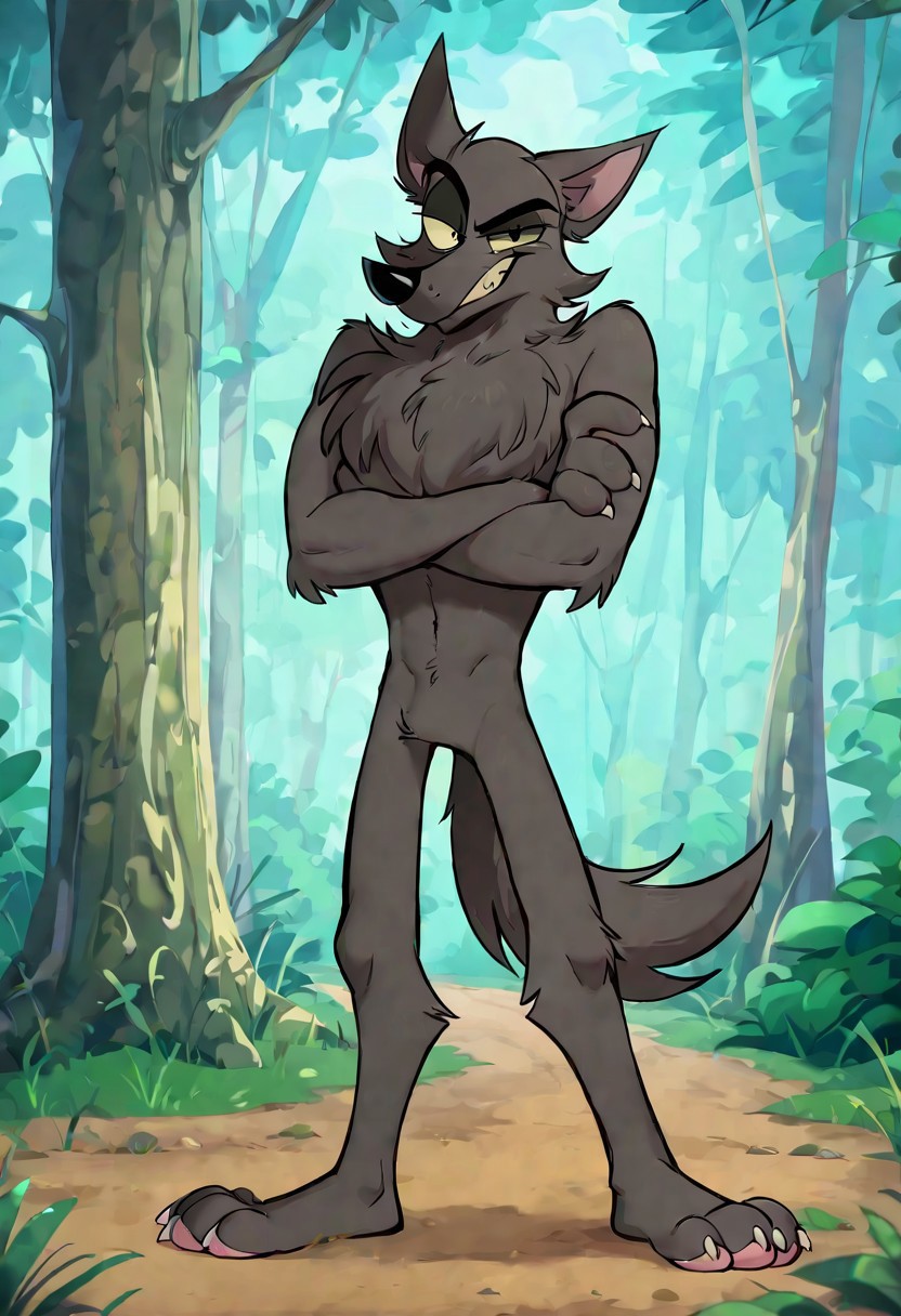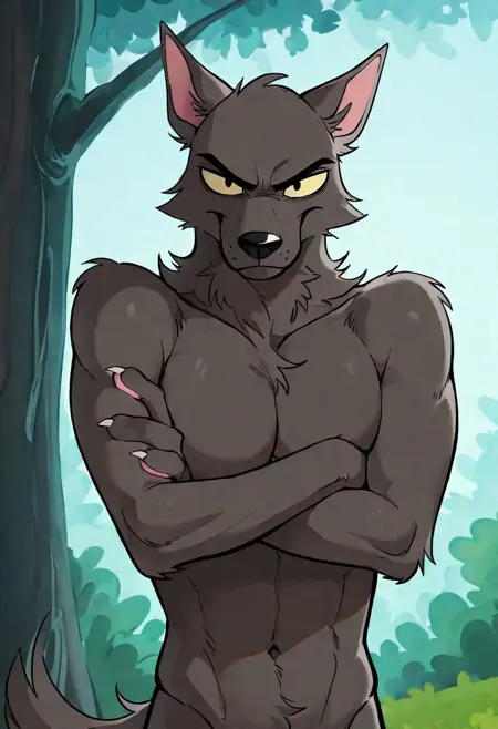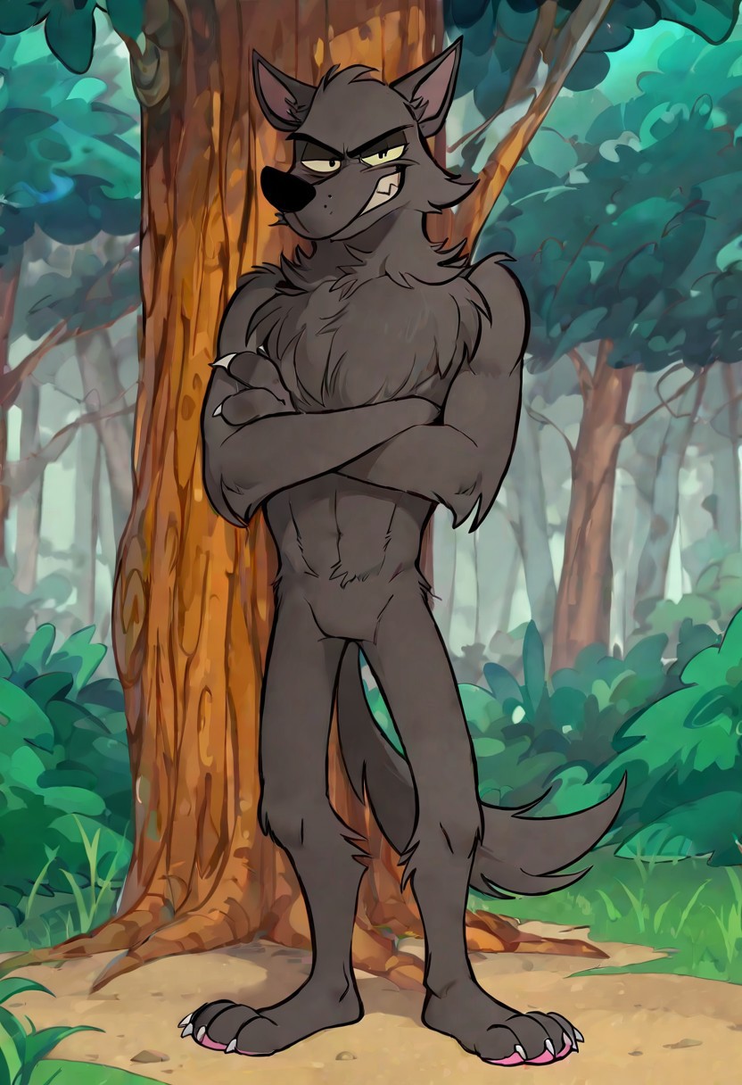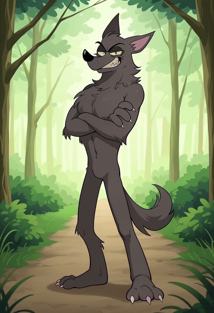 b1g bad wolf, anthro, male, grayish fur, black nose, black eyes, claws, wolf tail, pink paw pads