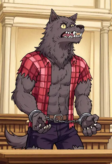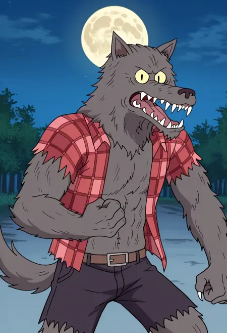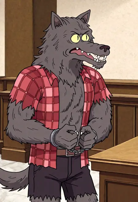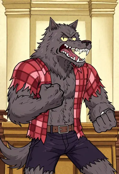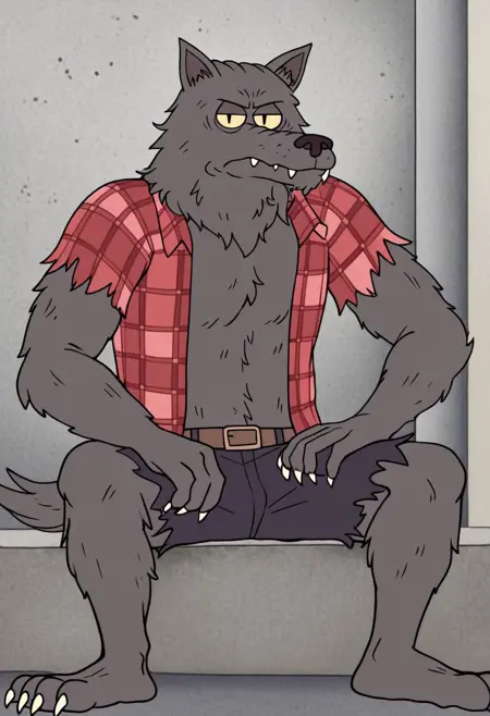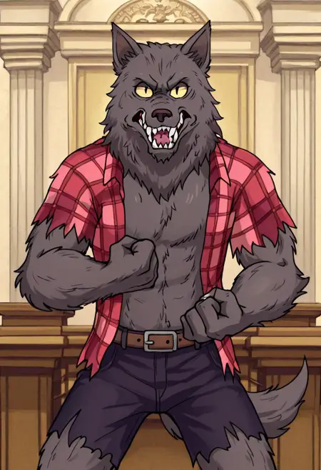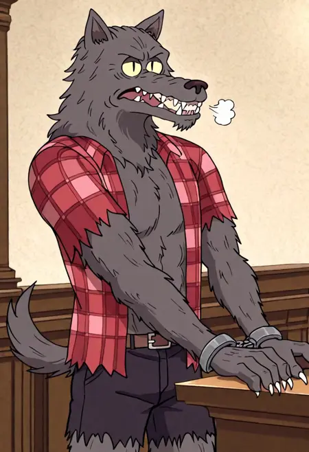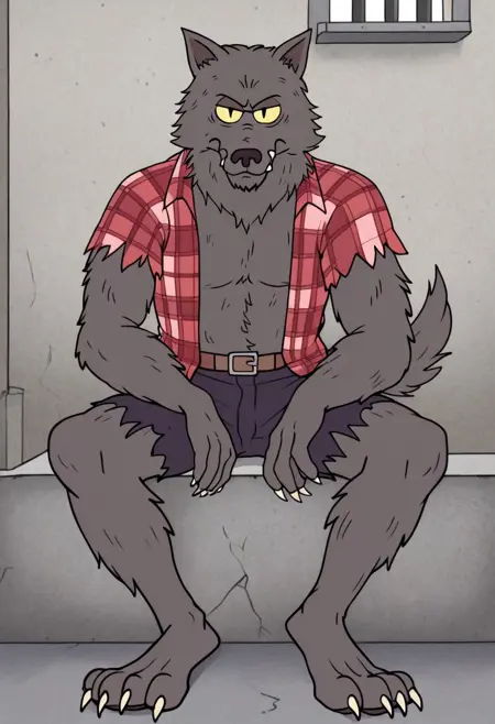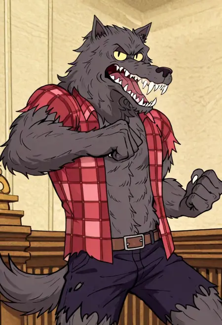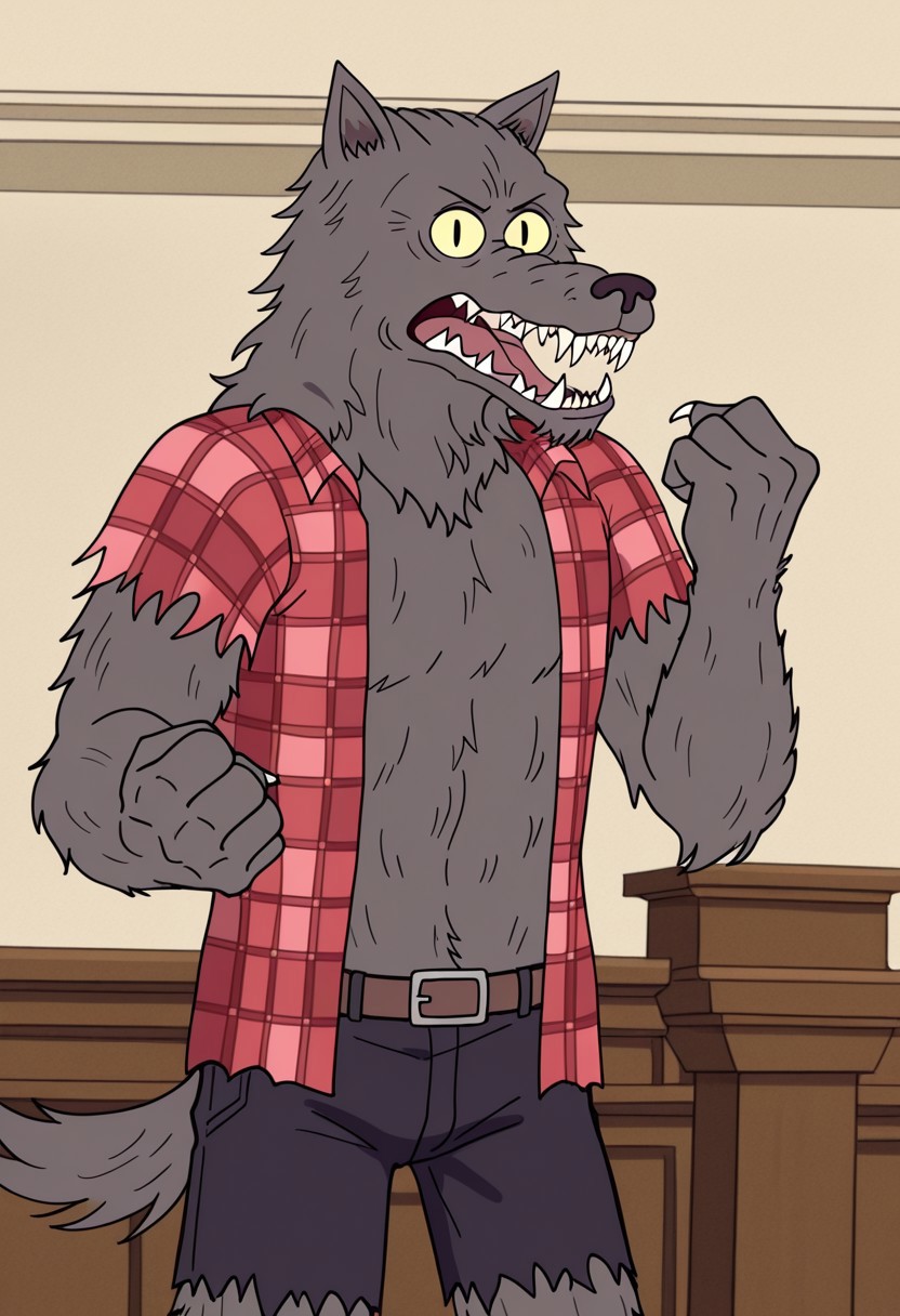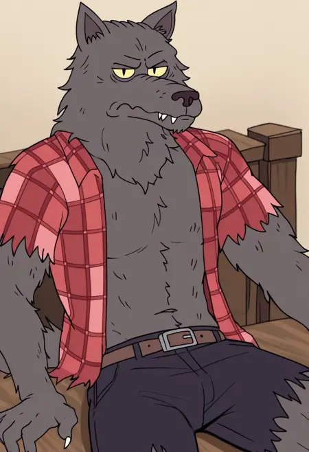 w0lfhard, werewolf, grey fur, dark brown nose, yellow sclera, slit pupils, sharp teeth, claws, tail, open torn red plaid shirt, brown belt, torn purple-grey short pants