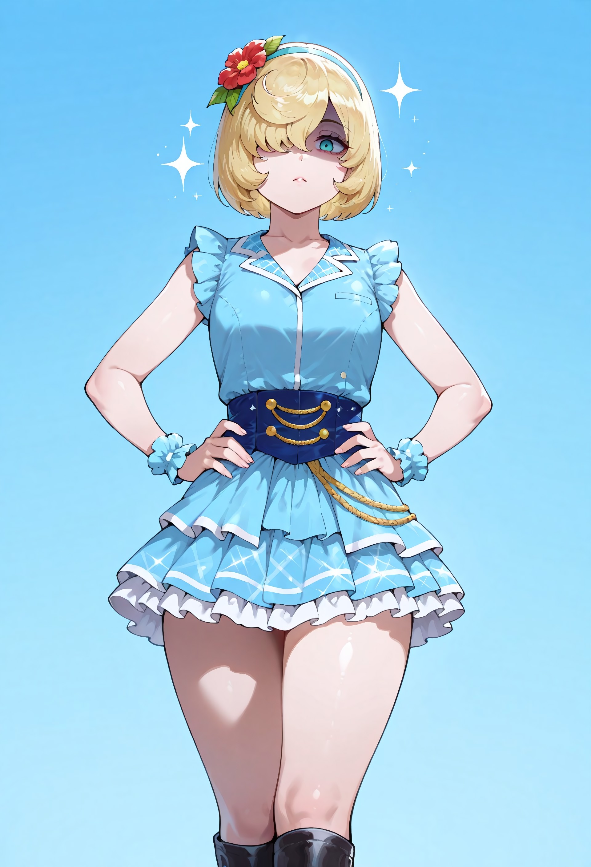 아이돌 옷, 머리 장식, 꽃 헤어밴드, 파란 드레스, 소매 없음, 파란 치마, 미니스커트, 프릴 치마, 주름 치마, 파란 손목 장갑, 검은 신발, 무릎 부츠