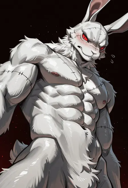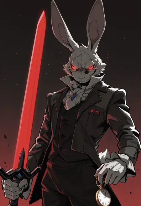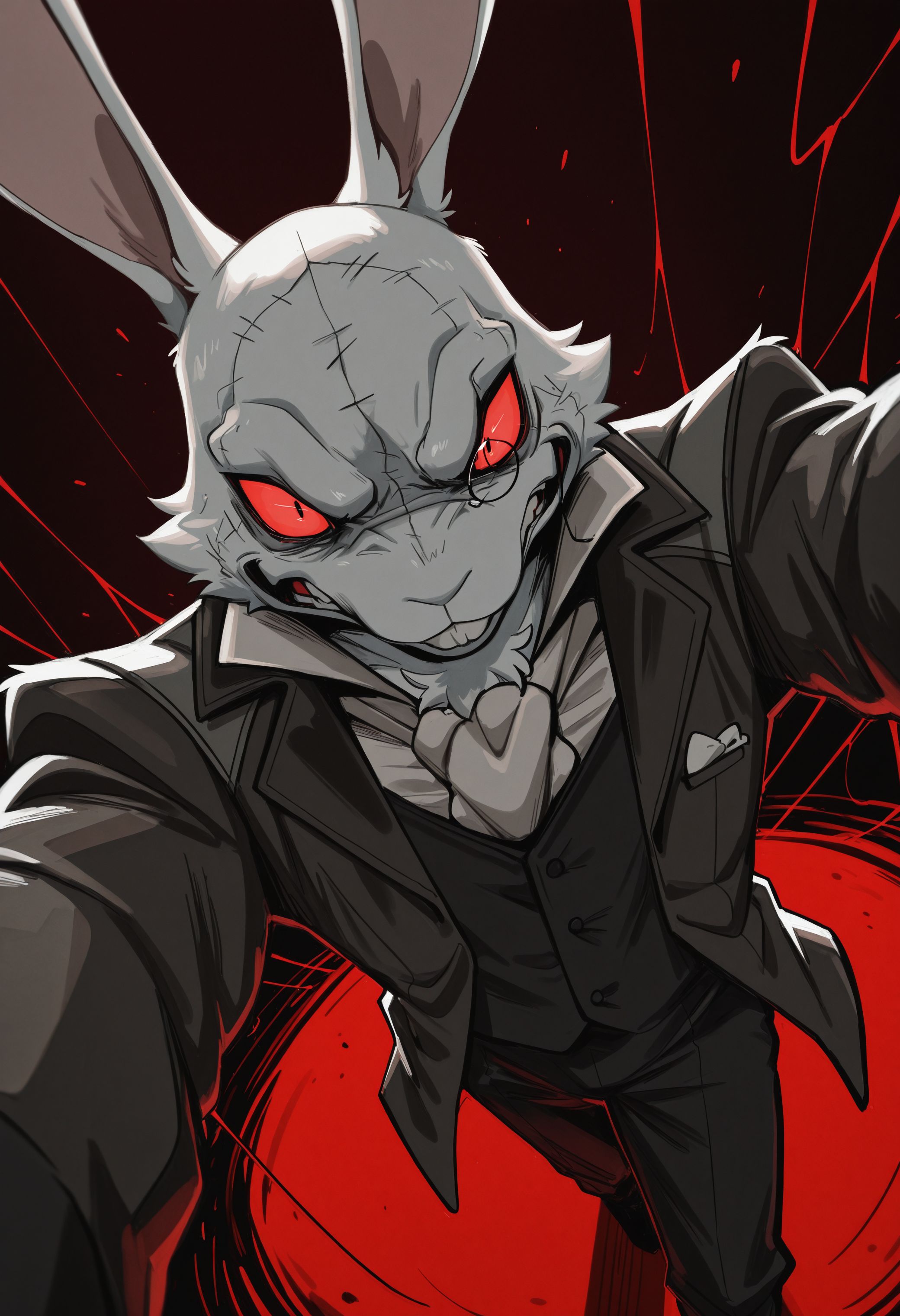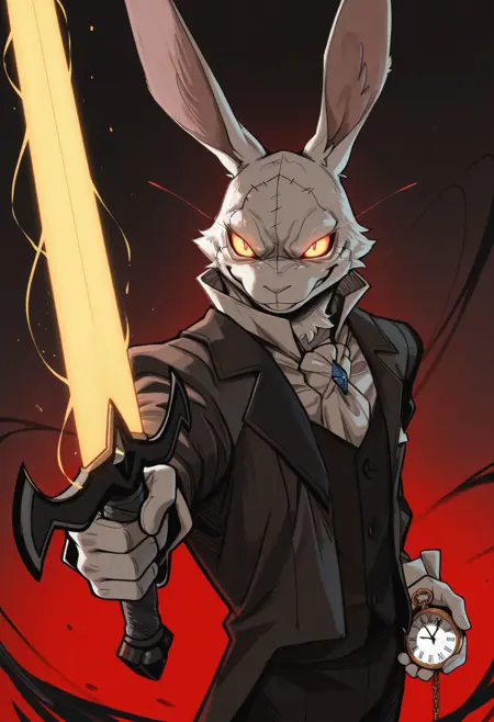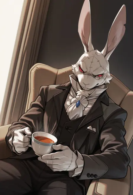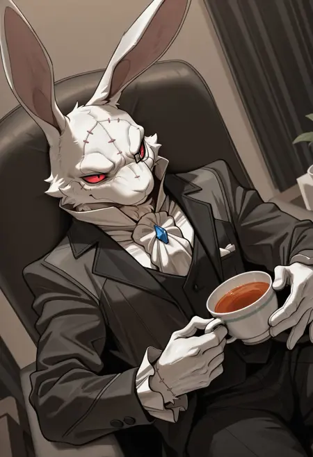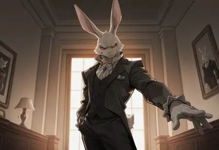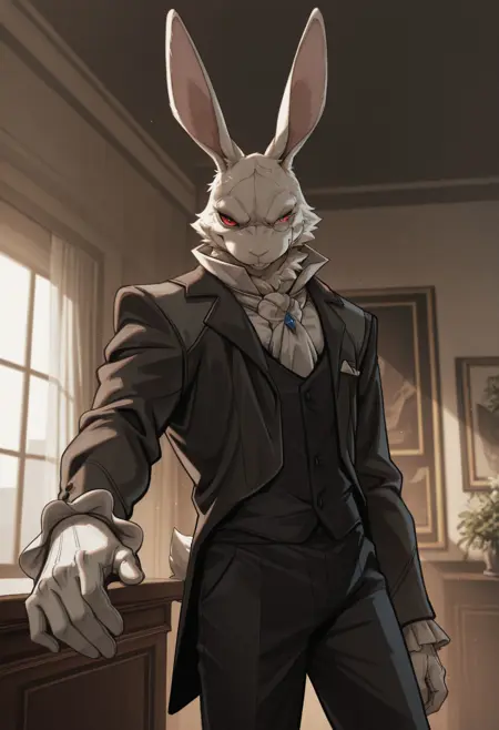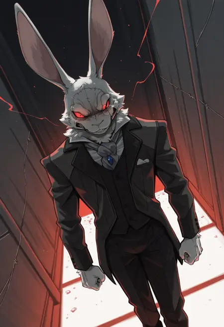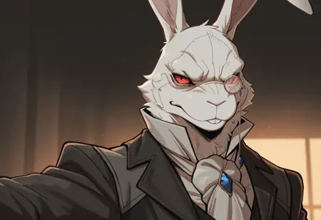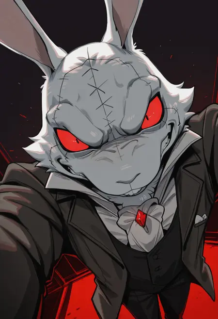 Illustrious: best quality, amazing quality, very aesthetic, absurdres, newest, white_rabbit_dmc, furry, furry male, solo, rabbit ears, formal, stitches, red/yellow eyes, smile, ...your tags...