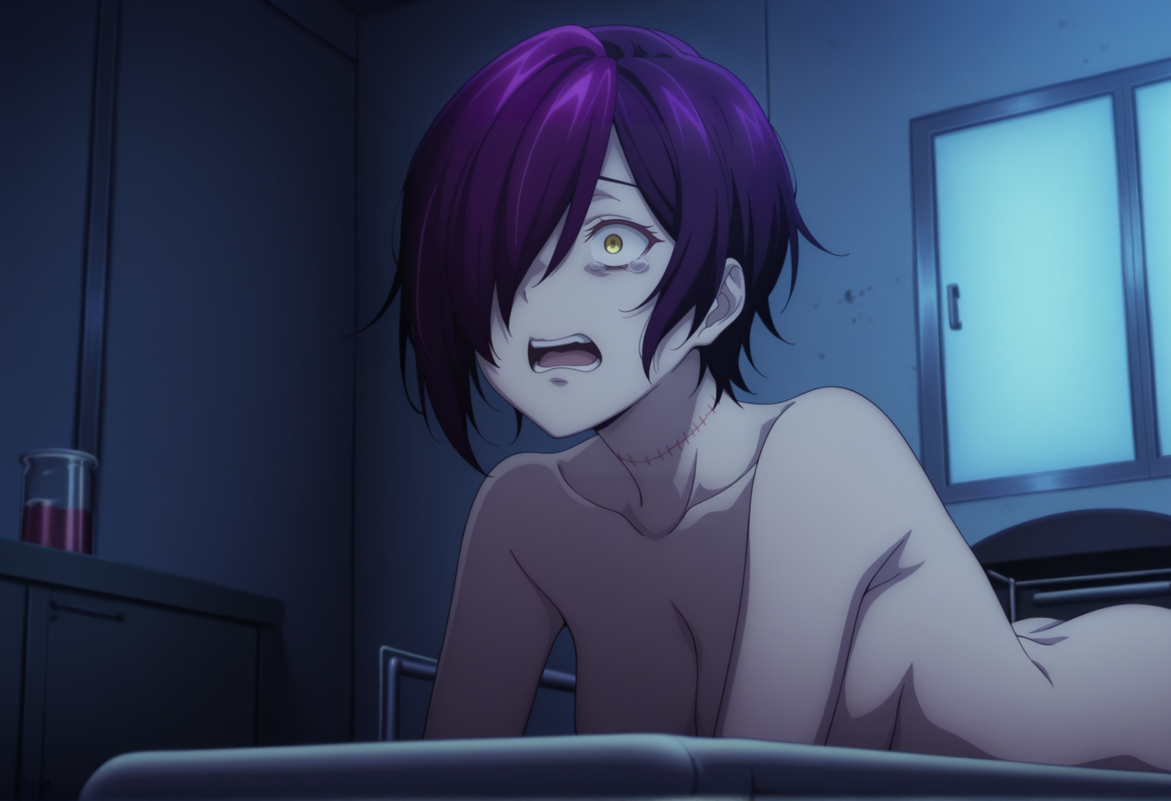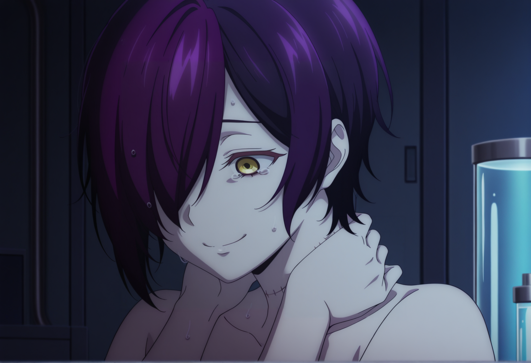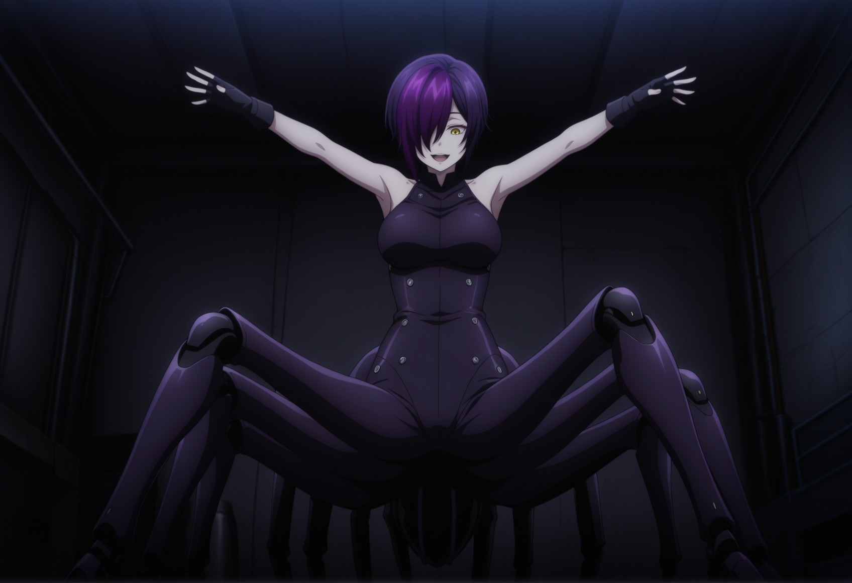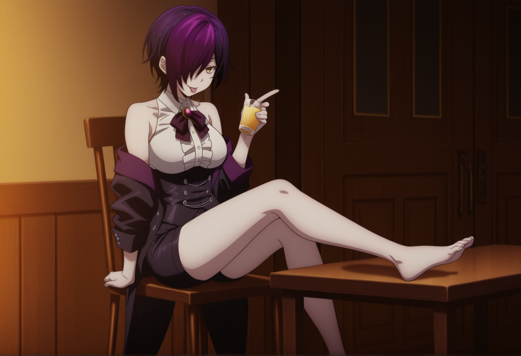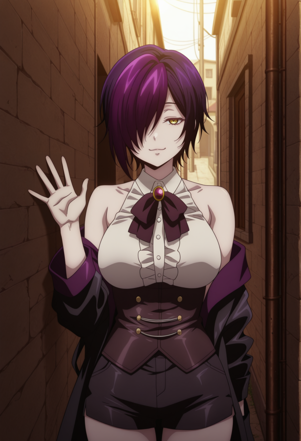 주요 태그: 짧은 머리, 노란 눈, 다색 머리, 보라색 머리, 한 눈을 가린 머리, 흰색 블라우스, 소매 없음, 목 끈, 브로치, 코트, 어깨 드러남, 코르셋, 반바지