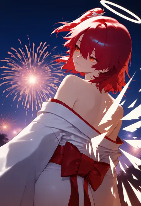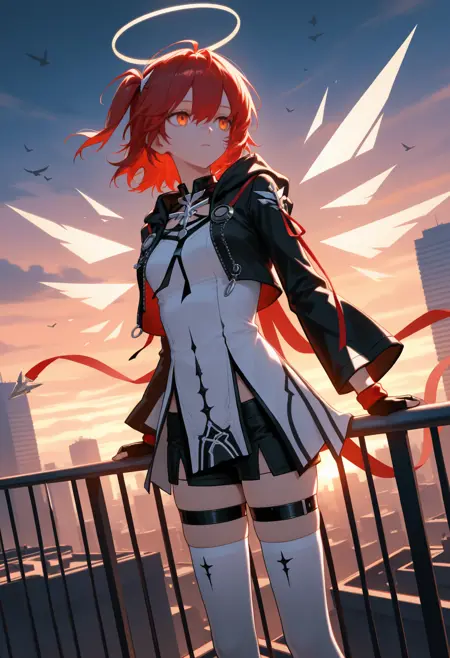 触发词 + 外观: exicnvn, 分离的翅膀, 能量翅膀, 短发, 红发, 发丝位于眼睛之间, 一侧向上, 光环, 橙色眼睛