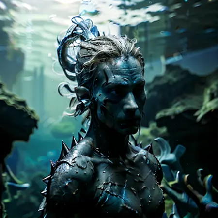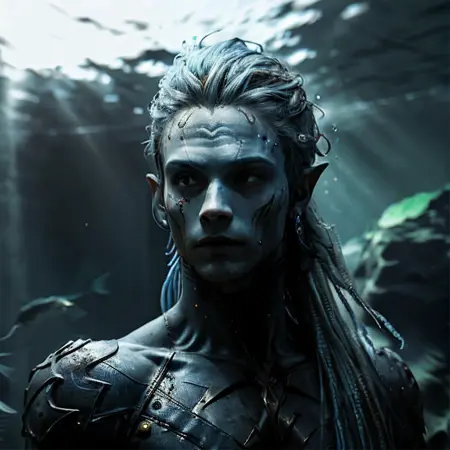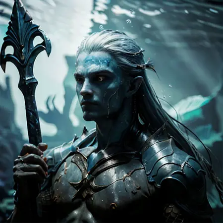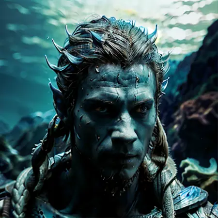 1boy, armor, beard, black hair, blonde hair, blue eyes, blue skin, blurry, blurry background, bracelet, braid, brown hair, chainmail, closed mouth, colored skin, facial hair, facial mark, facial tattoo, fins, green eyes, grey hair, grey skin, helmet, holding, holding polearm, holding staff, holding sword, holding weapon, jewelry, long hair, looking at viewer, male focus, manly, mask, merfolk male, muscular, muscular male, mustache, necklace, old, old man, open mouth, pointy ears, polearm, ponytail, realistic, red eyes, ring, scales, scar, shoulder armor, solo, spear, spikes, staff, swimming, sword, tattoo, trident, upper body, weapon, white hair