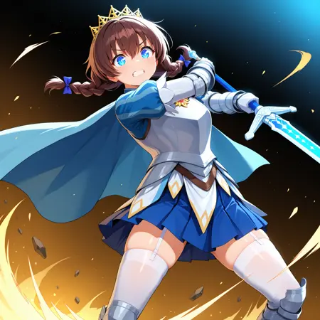 white_cape,blue_dress,gloves,skirt,armor,crown,white,breastplate,gauntlets,greaves,armored boots,armored dress,blue skirt,pleated skirt,garter belt,garter straps,white thighhighs,boots