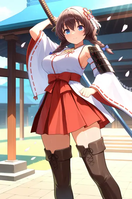 ricca_miko,hair ornament,japanese armor,japanese clothes,nontraditional miko,shoulder armor ,wide sleeves,ribbon-trimmed sleeves,red skirt,thigh boots,brown footwear, brooch, flower brooch,chest brooch,