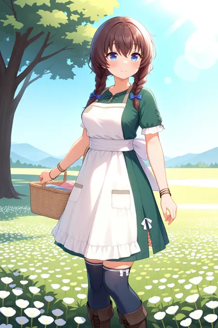 ricca_casual,green dress,white apron,back bow,short sleeve,bracelet,pocket,black_thighhighs,over-kneehighs,,brown footwear,boots,side slit,cross-laced slit,