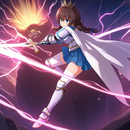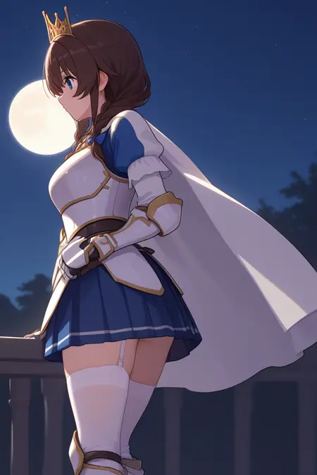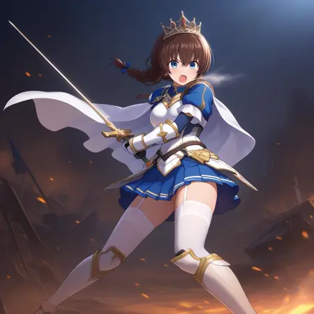 white_cape,blue_dress,gloves,skirt,armor,crown,white,breastplate,gauntlets,greaves,armored boots,armored dress,blue skirt,pleated skirt,garter belt,garter straps,white thighhighs,boots