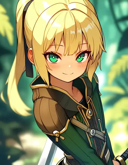 blonde hair, green eyes, ponytail