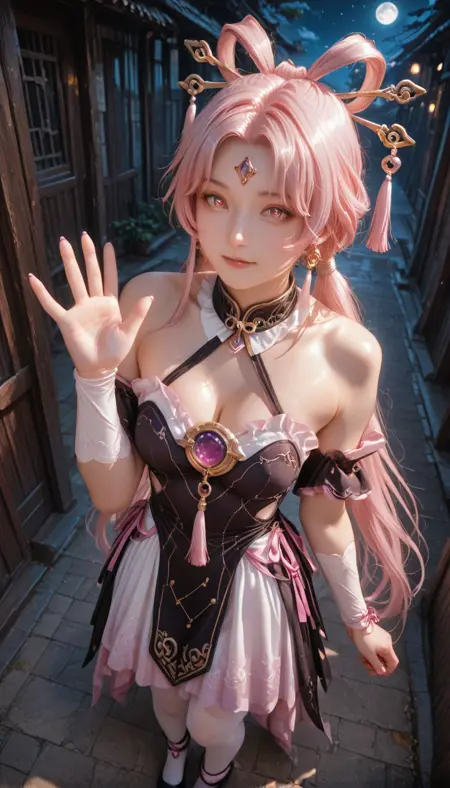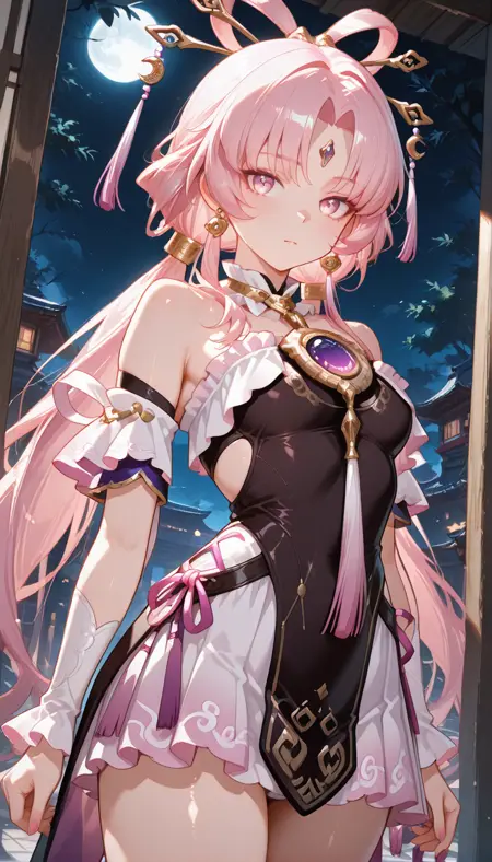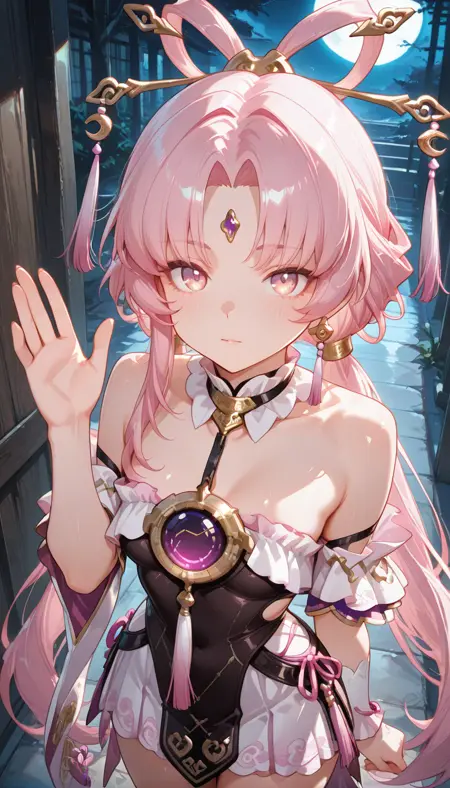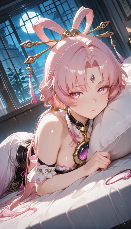 HFuXuan, 보석, 어깨 노출, 매우 긴 머리, 더블테일, 분홍색 머리, 귀걸이, 작은 가슴, 분홍색 눈, 갈라진 앞머리, 낮은 더블테일, 분홍색 손톱, 머리 고리, 머리 막대, 이마 보석, 테셀 귀걸이, 활 모양의 머리, 테셀 머리 장식, 이색 눈,