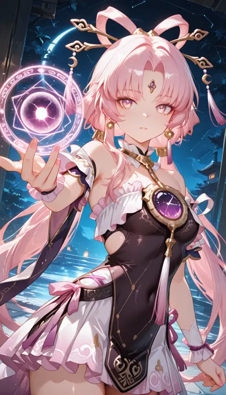 HFuXuan, jewelry, bare shoulders, very long hair, twintails, pink hair, earrings, small breasts, pink eyes, parted bangs, low twintails, pink nails, hair rings, hair stick, forehead jewel, tassel earrings, bow-shaped hair, tassel hair ornament, two-tone eyes,